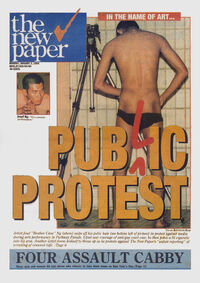 In response to both the entrapment exercise, the disproportionately severe punishments handed out and the sensationalist treatment of this as well as other gay-related news stories by the press, two Singaporean artists, Josef Ng (born in Thailand) and Shannon Tham, created performance pieces that the government clearly found threatening to the dominant order. Ng and Tham’s works were presented in the context of a 12-hour New Year’s Eve event which included numerous other performances, literary readings and live music. Early in the morning on Friday, 31 December 1993 at the 5th Passage Gallery which occupied a service corridor in Parkway Parade, a large suburban shopping center dominated by Isetan and Yaohan department stores, Josef Ng gave a performance entitled "Brother Cane", apparently alluding to the caning sentence meted out to the victims of the entrapment operation.