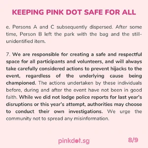 8. Pink Dot SG is dismayed that we have to address this issue, instead of focusing on those for whom we fight to hold this space every year: the thousands of queer people and their allies who showed up to make a stand for a more inclusive Singapore.