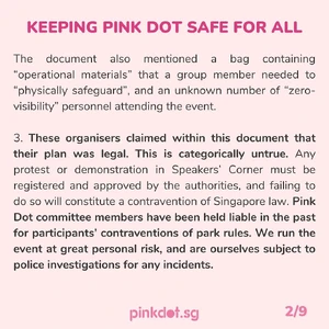 3. These organisers claimed within this document that their plan was legal. This is categorically untrue. Any protest or demonstration in Speakers’ Corner must be registered and approved by the authorities, and failing to do so will constitute a contravention of Singapore law. Pink Dot committee members have been held liable in the past for participants’ contraventions of park rules. We run the event at great personal risk, and are ourselves subject to police investigations for any incidents.