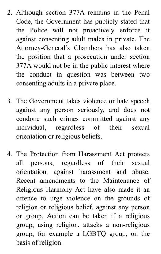 "2. Although section 377A remains in the Penal Code, the Government has publicly stated that the Police will not proactively enforce it against consenting adult males in private. The Attorney-General’s Chambers has also taken the position that a prosecution under section 377A would not be in the public interest where the conduct in question was between two consenting adults in a private place.
