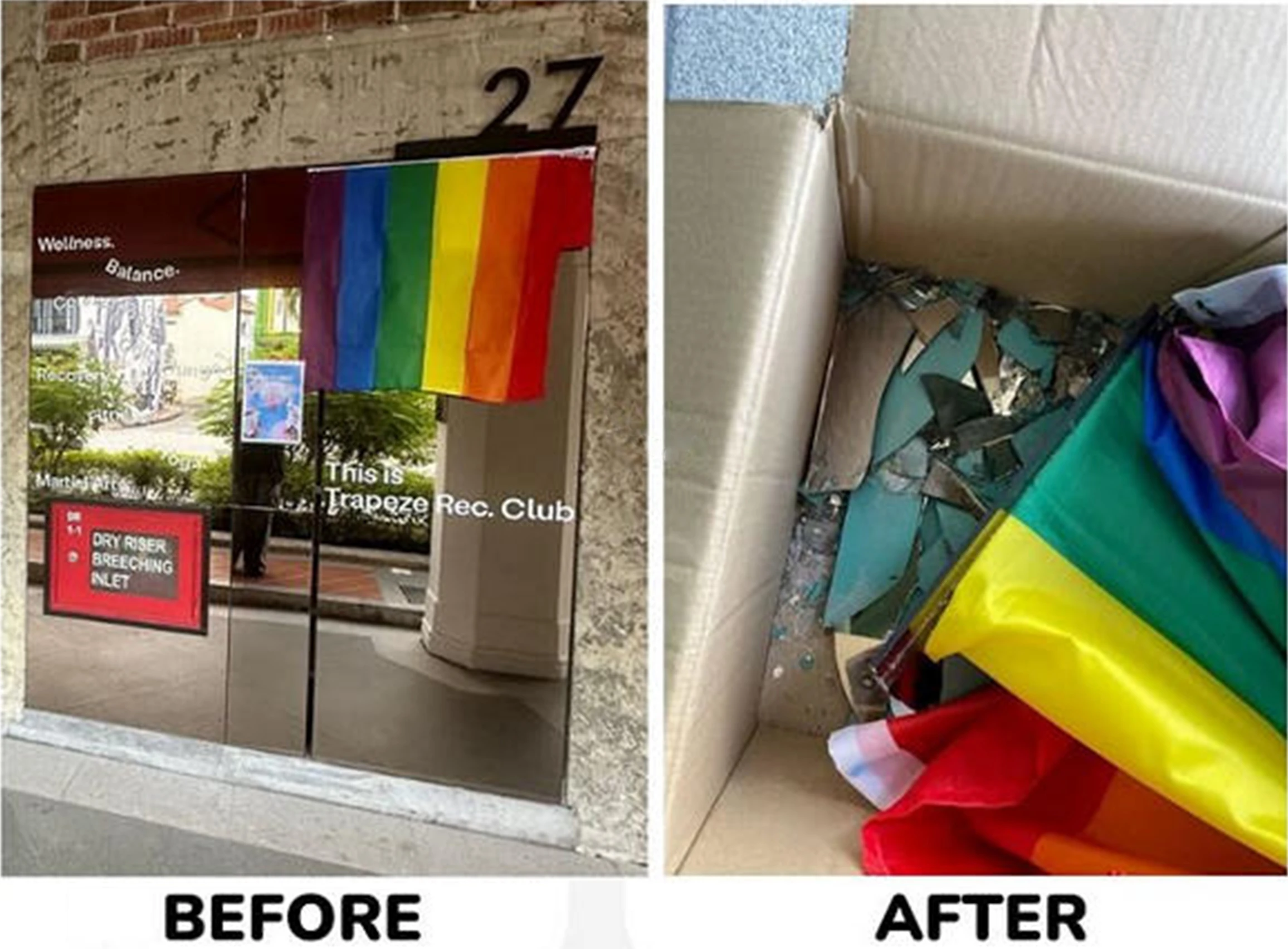 On Friday, 28 June 2024, the eve of Pink Dot, a pride flag hung outside Trapeze Rec. Club, a holistic wellness club in Tanjong Pagar, was forcibly removed and thrown to the ground, according to its management which posted news of the incident on its Instagram account[28],[29]. CCTV footage showed that the act of yanking off the flag caused a mirror on its storefront to be shattered in the process. It added that the “act of hate” had left them “deeply saddened and disappointed. At Trapeze Rec. Club, we pride ourselves on being an inclusive space where everyone is welcome, no matter who you are. While this incident hurts, it strengthens our resolve to continue standing up for love, acceptance, and equality.