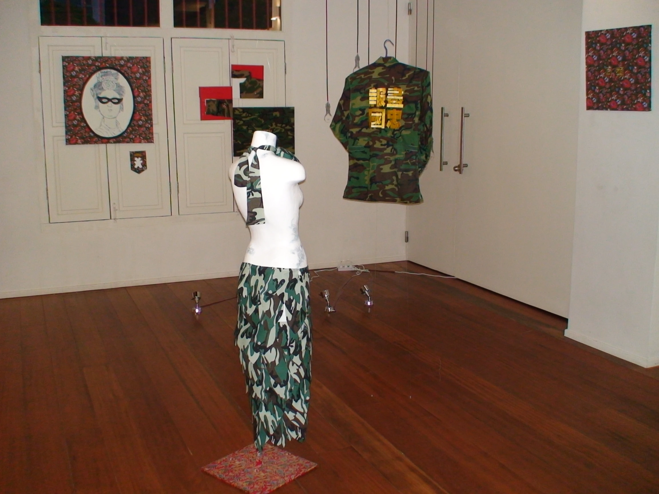 Justin Lee’s The Queen of Happiness II confronts the viewer with army fatigues festooned with a sparkling brooch. You almost take a step back, either dazzled by the ornament or shocked by the incongruity of the combination. But why should that be, we have to ask? Why is national defence in our minds so wrapped up with gender constructions? And in such a climate, how do we treat those whom we conscript, who do not conform?