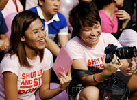 Finally, the afternoon’s highlight took place with more than 2,000 people coming together to form the giant Pink Dot[45], orchestrated and counted down by theatre actress Pam Oei. It marked a milestone for the LGBT community and made for a great, iconic photo opportunity (henceforth affectionately called "the money shot" by the organising committee) that would gain the event international awareness[46],[47],[48],[49],[50] and spawn copycat aerial photographs in later years like the SG50 gathering in 2015.