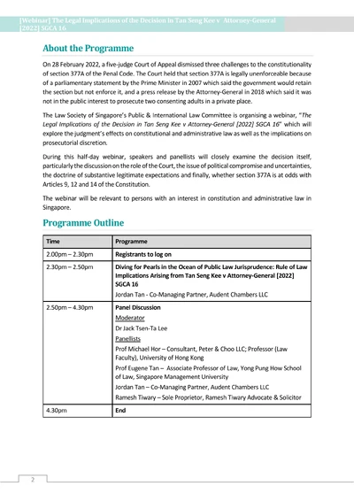 On Friday, 13 May 2022, a live webinar entitled, "The Legal Implications of the Decision in Tan Seng Kee v Attorney-General [2022] SGCA 16" was conducted from 2:30pm to 4:30pm by the Law Society of Singapore. During the event, speakers and panellists closely examined the decision itself, particularly the discussion on the role of the Court, the issue of political compromise and uncertainties, the doctrine of substantive legitimate expectation and finally, whether Section 377A was at odds with Articles 9, 12 and 14 of the Constitution.