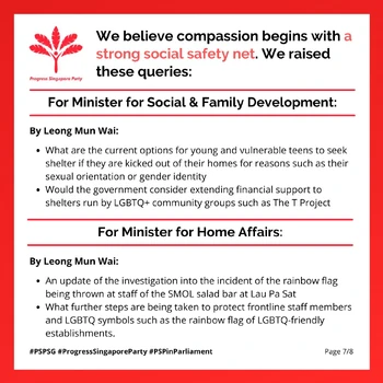 Prior to the May 2021 Parliamentary session, the Progress Singapore Party announced that it would "continue to raise important questions in Parliament for a more compassionate Singapore" and that it believed "compassion begins with a strong social safety net"[65]. Leong Mun Wai raised the following queries for the Minister for Social and Family Development: