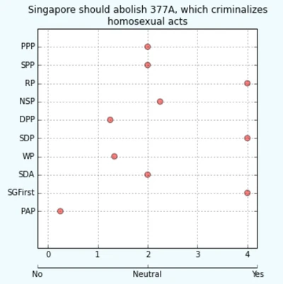 Shortly before the 2015 General Election, a group of third-year students from Yale-NUS College created Electionaire, a website which compares the policy positions of 10 political parties on several issues, including the repeal of Section 377A[66]. It is not supported, funded or aligned with any political party.