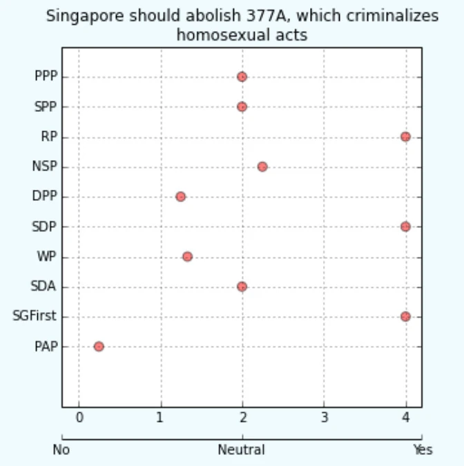 The chart on the left depicts survey respondents' agreement with the policies of the various political parties regarding Section 377A.