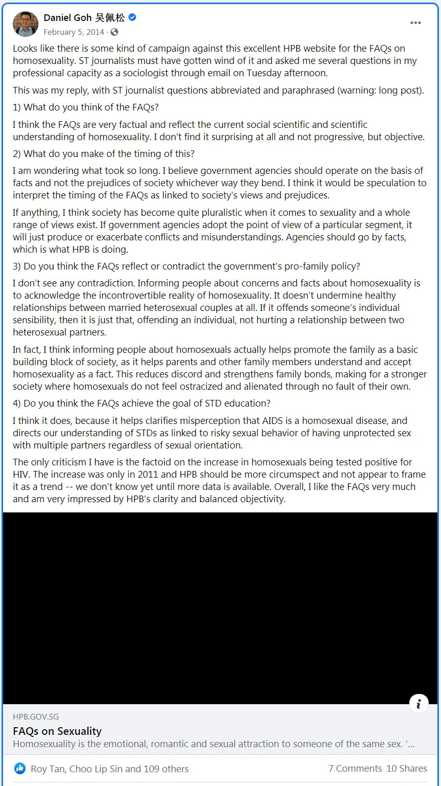 In September 2018, Goh made two posts on his Facebook saying that he would only be agreeable to repealing Section 377A if there was legislation or a mechanism to prevent the LGBT lifestyle as a norm.