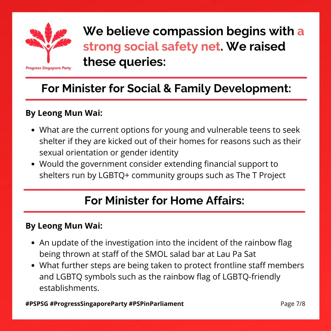 Prior to the May 2021 Parliamentary session, the Progress Singapore Party announced that it would "continue to raise important questions in Parliament for a more compassionate Singapore" and that it believed "compassion begins with a strong social safety net"[65]. Leong Mun Wai raised the following queries for the Minister for Social and Family Development: