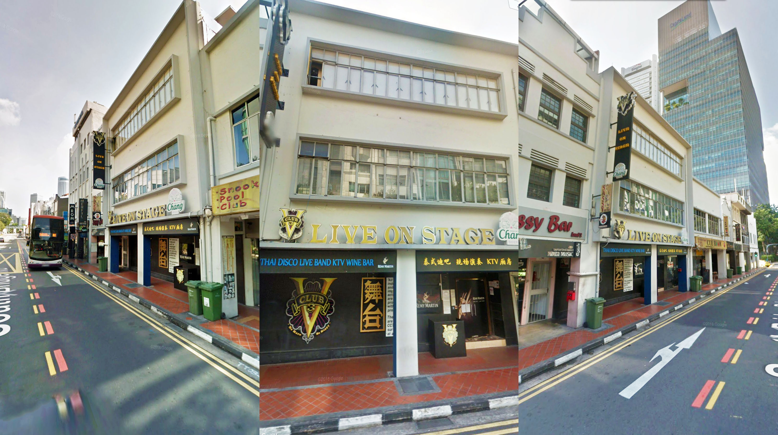 3 views of the shophouse unit, no. 69, along South Bridge Road that used to be occupied by Spartacus (Google Street View, 2018).